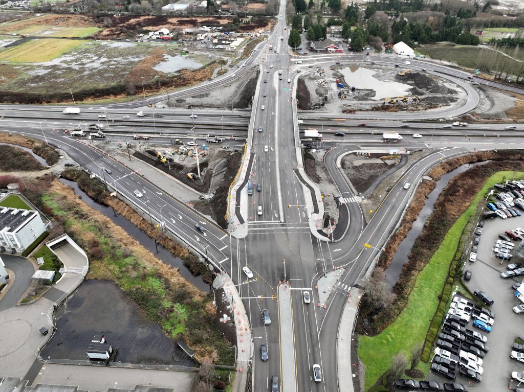 The modernized interchange provides more vehicle lanes, improved transit operations, and includes sidewalks and cycling lanes in both directions for the first time.